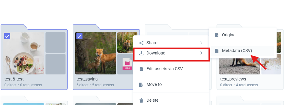 DAM allows you to export folder metadata to a CSV in multiple ways, depending on where you trigger the action from. All methods provide the same export options.