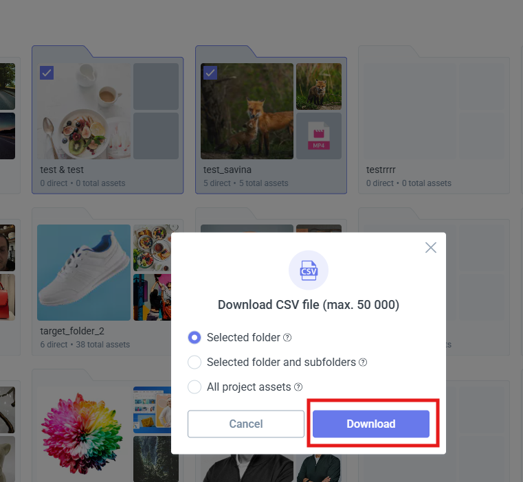 DAM gives you the advantage of exporting the information for the files located in a folder into a CSV document. This CSV document contains the file size, file CDN link, file path, file mime type, file SHA1, file UUID, create at, and updated at dates.