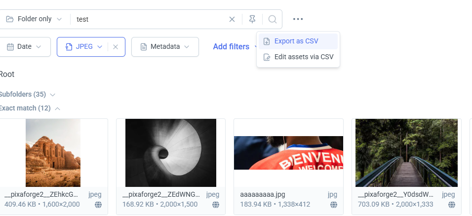 In addition to exporting files from folders, DAM also allows you to export Search results into a CSV file.