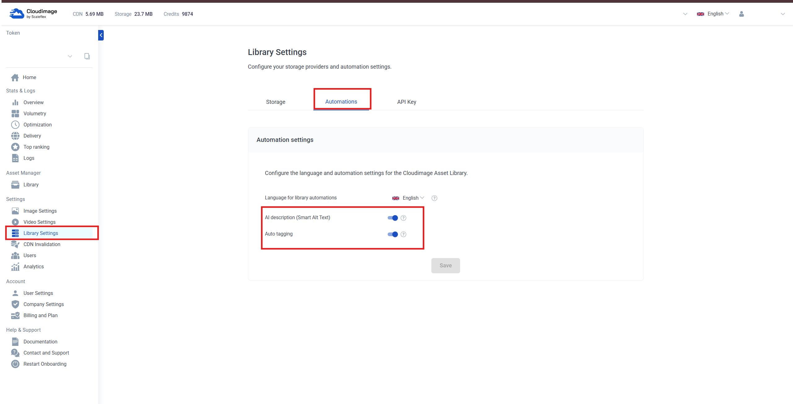 Auto-tagging with AI and Automatic Descriptions with AI (Smart Alt Text) can be activated in the Asset Library Settings.