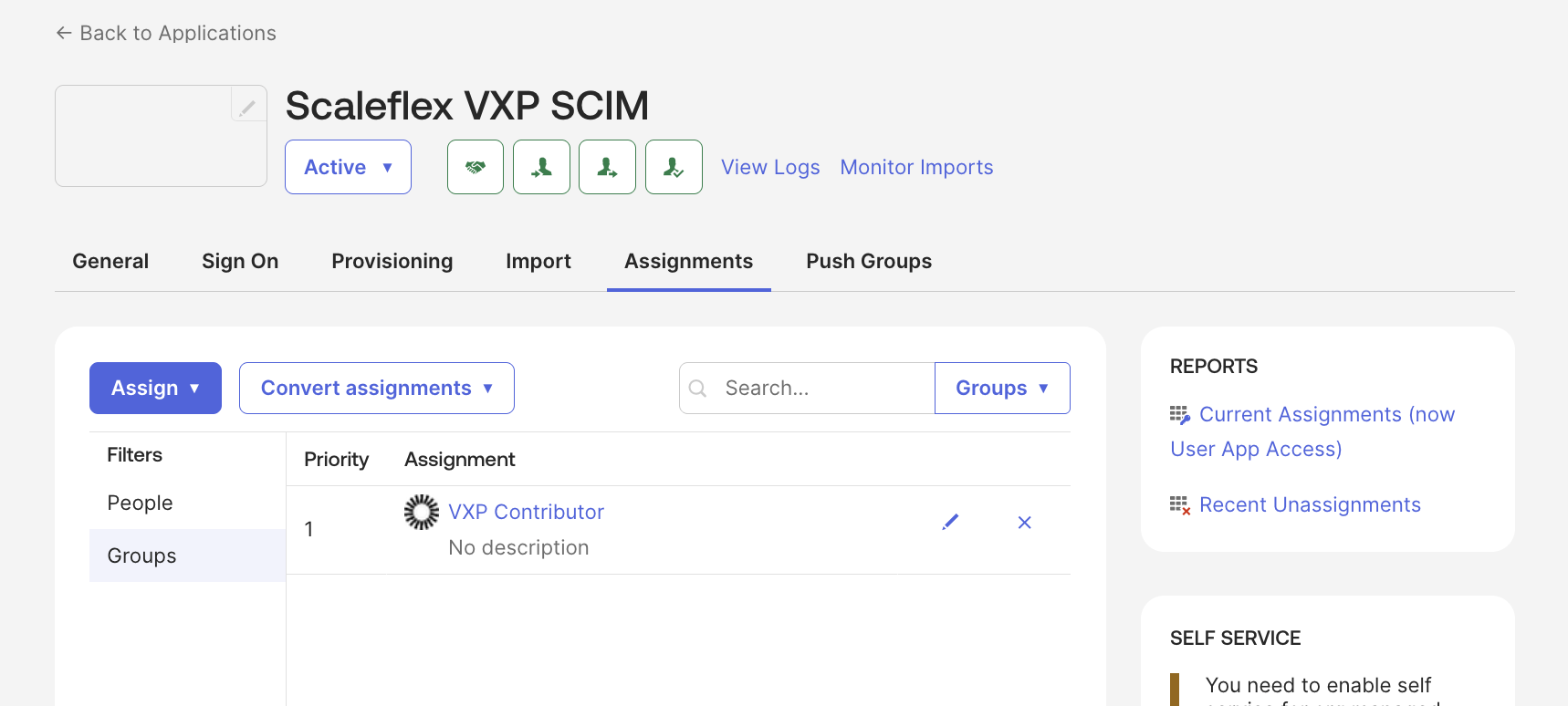- Navigate to the Assignments tab and review your assignments. We recommend using groups to assign users (1 group per user role in the Scaleflex VXP) to the application in Okta:
