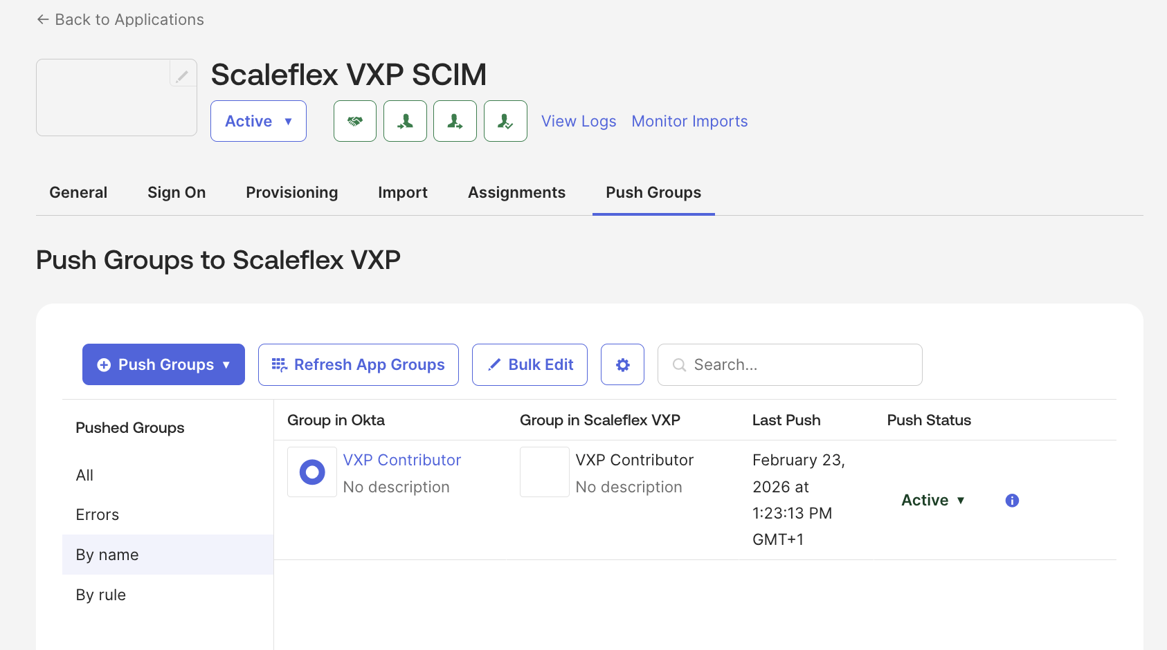 - Users assigned to the Okta app via groups-based assignment will be provisioned in the Scaleflex VXP and assigned the user profile mapped to the team in step 8.