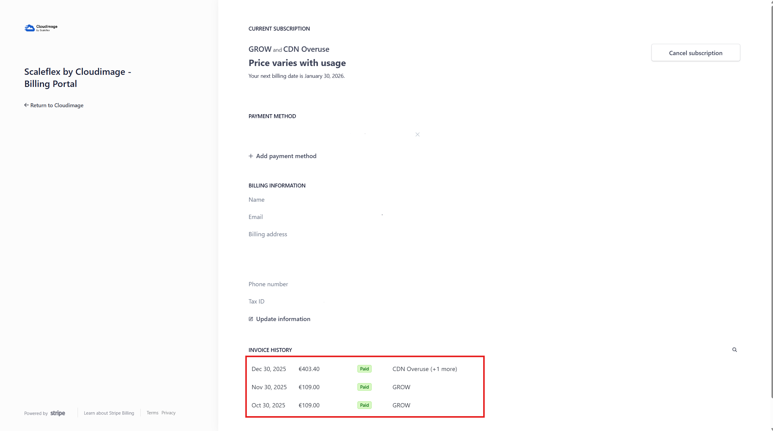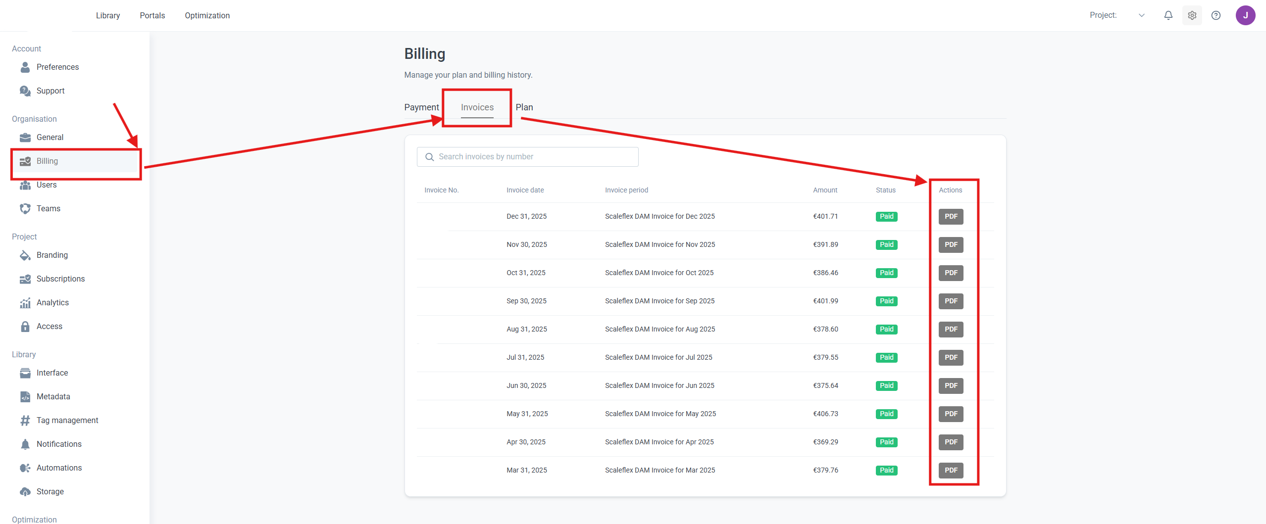 4. Under this section, you will see the Invoices section, where all your past invoices are available for download.