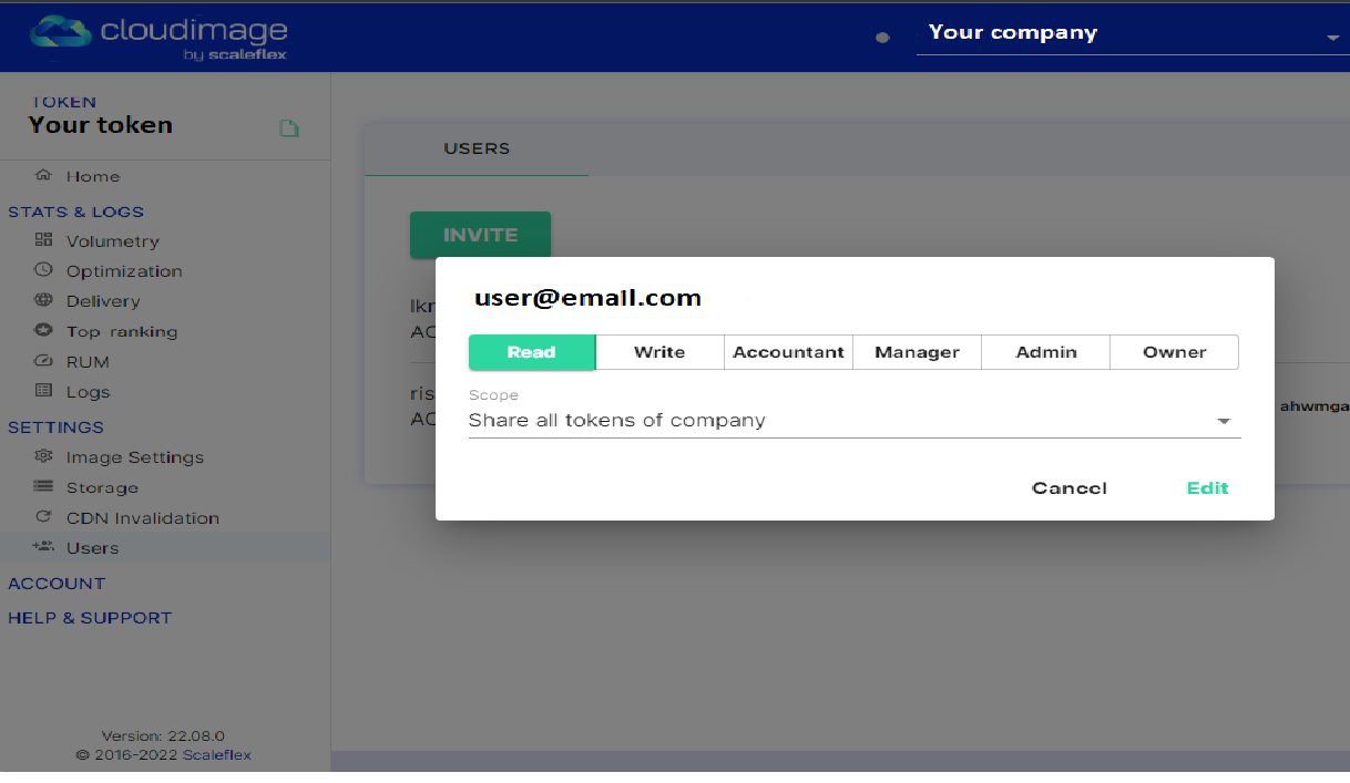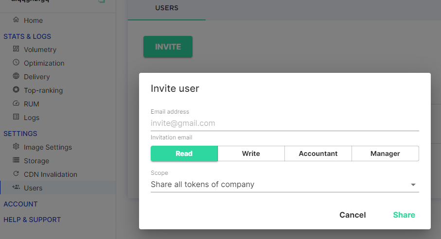 Before requesting the ownership change, ensure that the account of the new Owner is created in the console and it has an "active" status (the Invitation link that is sent to his email address is accepted). If the future Owner is missing from the list of the currently active Users, click the "Invite" button to send an invitation to his/her email to join Cloudimage. Once the invitation is accepted, you can proceed to the next step.