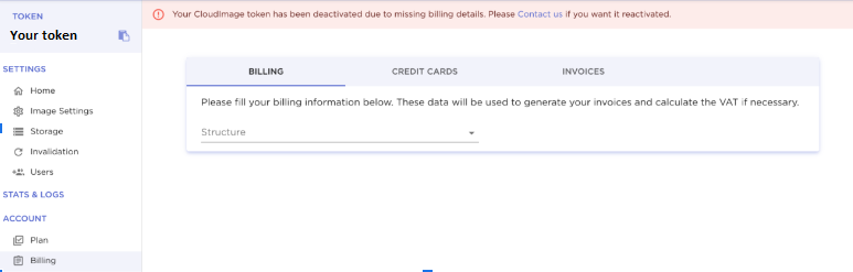 To re-activate your token you need to fill the corresponding data in the Cloudimage / DMO Admin Panel -> section Account -> Billing and Plan -> tabs Plans -> Scroll down -> Click "Manage":