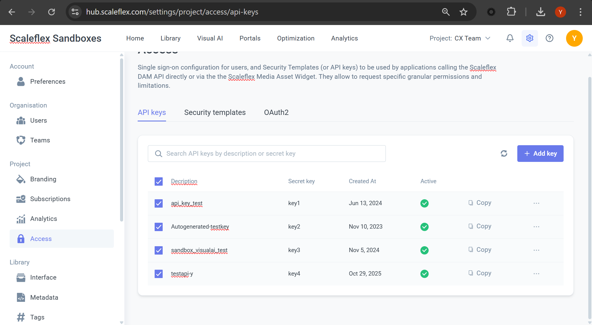 In the DAM Admin panel navigate to Access > API Keys and click on the Add key: