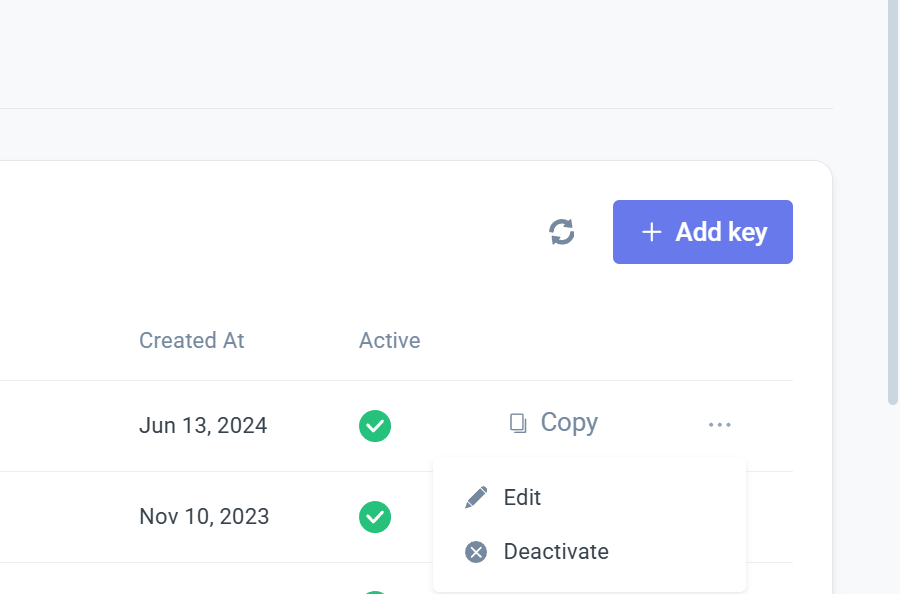 Once the API Secret Key is saved, you can review/edit its Permissions, rename or deactivate it from the list: